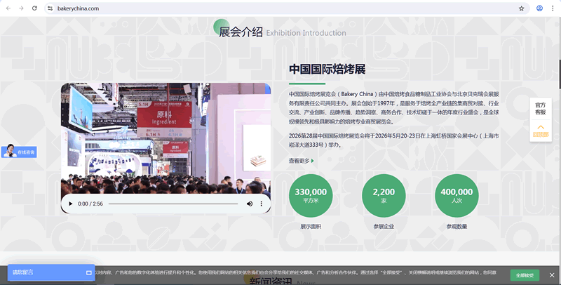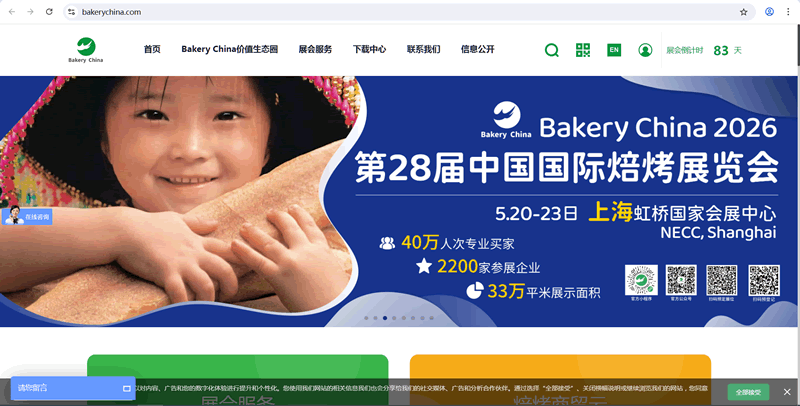 中国国际焙烤展览会(Bakery China)由中国焙烤食品糖制品工业协会与北京贝克瑞会展服务有限责任公司共同主办。展会创始于1997年,是服务于焙烤全产业链的集商贸对接、行业交流、产业创新、品牌传播、趋势洞察、商务合作、技术切磋于一体的年度行业盛会,是全球规模领先和极具影响力的焙烤专业商贸展览会。 2026第28届中国国际焙烤展览会将于2026年5月20-23日在上海虹桥国家会展中心(上海市崧泽大道333号)举办。