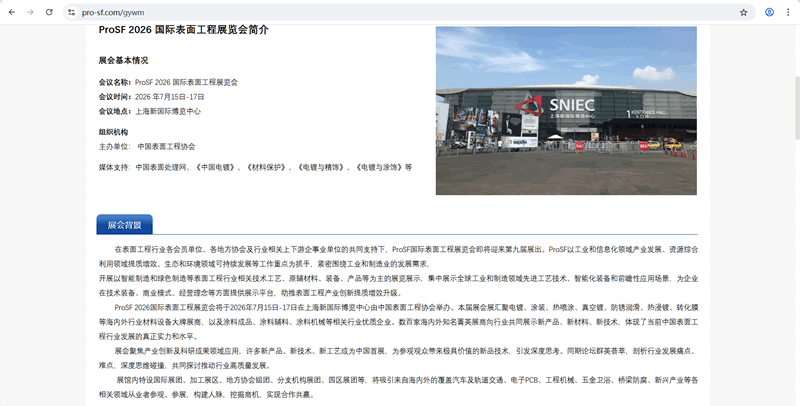 ProSF 2026国际表面工程展览会将于2026年7月15日-17日在上海新国际博览中心由中国表面工程协会举办。本届展会展汇聚电镀、涂装、热喷涂、真空镀、防锈润滑、热浸镀、转化膜等海内外行业材料设备大牌展商,以及涂料成品、涂料辅料、涂料机械等相关行业优质企业。数百家海内外知名菁英展商向行业共同展示新产品、新材料、新技术,体现了当前中国表面工程行业发展的真正实力和水平。
